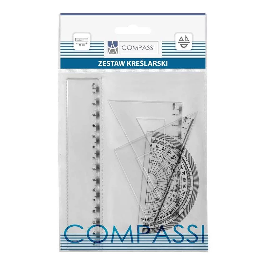 Szkolny, geometryczny zestaw kreślarski w przezroczystym etui z zawieszką. Zestaw zawiera kątomierz 180 stopni, dwie ekierki oraz linijkę o długości 15 cm.