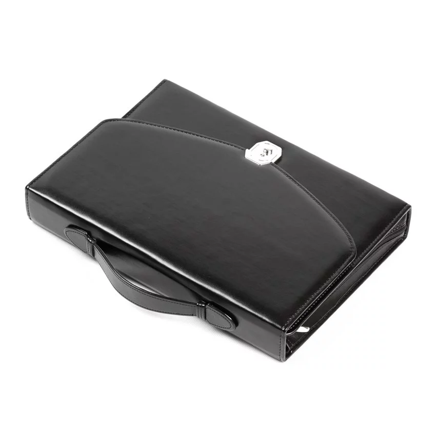 Klapa aktówki zamykana jest metalowym zamkiem. Sama aktówka posiada również rączkę.