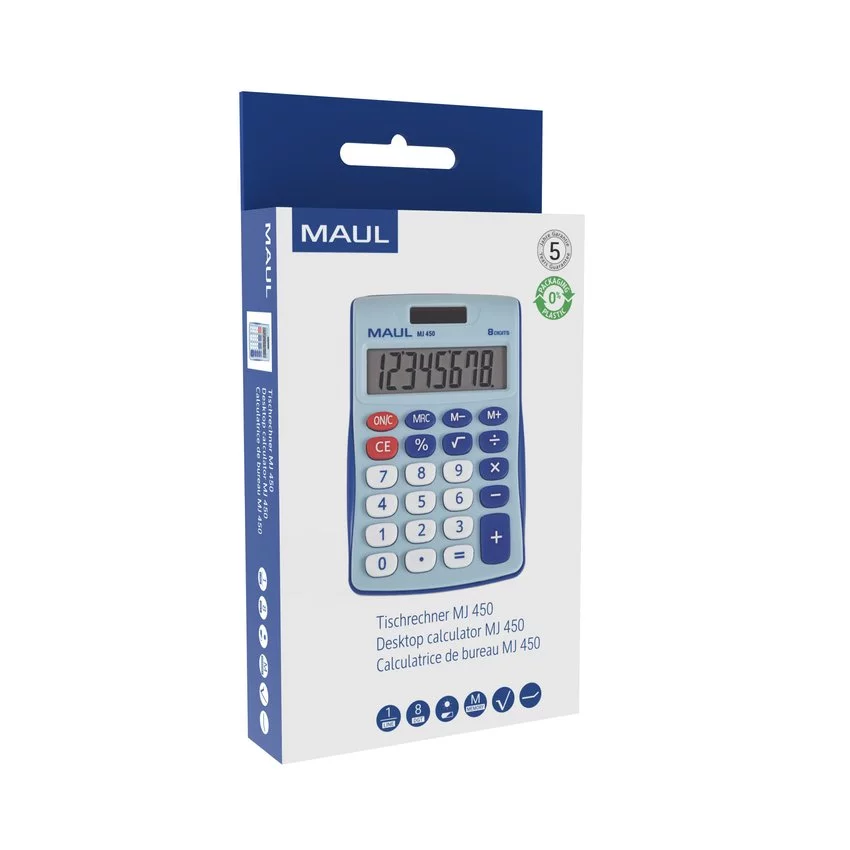 Biurkowy kalkulator MAUL M 450 w kolorze niebieskim z dużym, 8-pozycyjnym wyświetlaczem LCD. Niezawodny, stylowy i dokładny. Sprawiają, że życie staje się kolorowe! Dostępny w 3 wersjach kolorystycznych o świeżym i uniwersalnym designie. Doskonały do szkoły i w terenie. Szybsze wyszukiwanie: przyciski funkcyjne i numeryczne w różnych kolorach. Ergonomiczny wyświetlacz umieszczony pod kątem dla ułatwionego odczytu. Kompaktowy rozmiar i zaokrąglone krawędzie sprawiają, że dobrze leży w dłoni. Z łatwymi do czyszczenia, plastikowymi przyciskami. Energooszczędny, dzięki podwójnemu zasilaniu baterią i baterią słoneczna, z funkcją automatycznego wyłączania. Wyposażony w 3 przyciski pamięci, obliczanie pierwiastków kwadratowych i procentów. Antypoślizgowe punkty na spodzie kalkulatora. Gwarancja: 5 lat. Wymiary: 11,3 x 7,2 x 1,9 cm. Zawiera jedną baterię (LR1130). Ekologiczne opakowanie z tektury, bez użycia plastiku, z eurozawieszką.