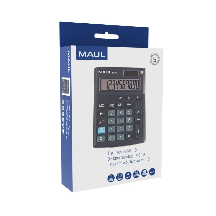 Solidny, wytrzymały kalkulator biurkowy MAUL MC 10 w kolorze czarnym z dużym, 10-pozycyjnym wyświetlaczem LCD. Niezawodny, dokładny i o profesjonalnym wyglądzie. Szybsze wyszukiwanie: przyciski funkcyjne i numeryczne w różnych kolorach. Ergonomiczny: wyświetlacz umieszczony pod kątem dla ułatwionego odczytu. Kompaktowy rozmiar i zaokrąglone krawędzie sprawiają, że dobrze leży w dłoni i nie zajmuje dużo miejsca na biurku. Przyciski z tworzywa sztucznego: wytrzymałe i łatwe do czyszczenia. Z antypoślizgowymi, gumowymi punktami na odwrocie. Energooszczędny, dzięki podwójnemu zasilaniu baterią i baterią słoneczna, z funkcją automatycznego wyłączania. Wyposażony w 3 przyciski pamięci, obliczanie pierwiastków kwadratowych, procentów, przycisk z podwójnym zerem, zmiana znaku oraz przycisk do kasowania ostatniej pozycji. Gwarancja: 5 lat. Wymiary: 13,7 x 10,3 x 3,1 cm. Zawiera jedną baterię (LR1130). Ekologiczne opakowanie z tektury, bez użycia plastiku, z eurozawieszką.