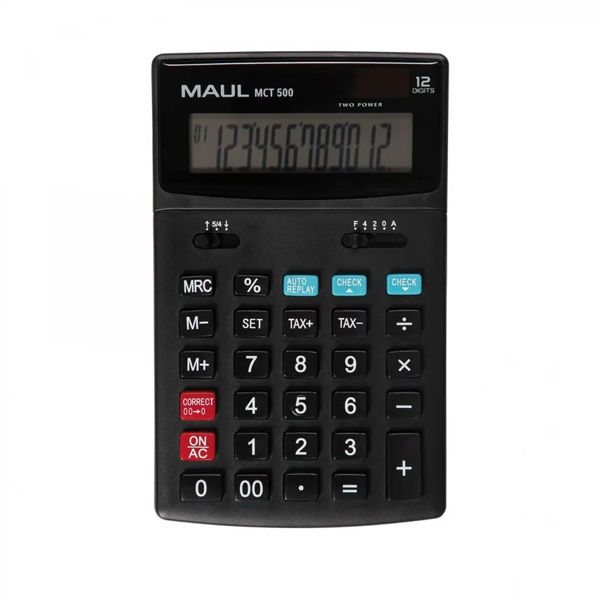 Kalkulator biznesowy MAUL MCT 500 w kolorze czarnym z dużym, 12-pozycyjnym wyświetlaczem LCD. Niezawodny, dokładny i o profesjonalnym wyglądzie. Szybsze wyszukiwanie: przyciski funkcyjne i numeryczne w różnych kolorach. Ergonomiczny: wyświetlacz może być umieszczony na płasko pod kątem dla ułatwionego odczytu. Duży rozmiar i wyraźniejszy wyświetlacz pozwalają na większy komfort pracy. Przyciski z tworzywa sztucznego: wytrzymałe i łatwe do czyszczenia. Z antypoślizgowymi, gumowymi punktami na odwrocie. Energooszczędny, dzięki podwójnemu zasilaniu baterią i baterią słoneczna, z funkcją automatycznego wyłączania. Funkcja sprawdź & popraw - możliwość sprawdzenia i poprawienia obliczeń. Wyposażony w 3 przyciski pamięci, obliczanie procentów, podatków, przycisk z podwójnym zerem. Dodatkowo możliwość automatycznego zaokrąglania w górę lub w dół oraz wyświetlanie cyfr po przecinku. Gwarancja: 5 lat. Wymiary: 17,4 x 10,7 x 2,2 cm. Zawiera jedną baterię (LR1130). Ekologiczne opakowanie z tektury, bez użycia plastiku, z eurozawieszką.