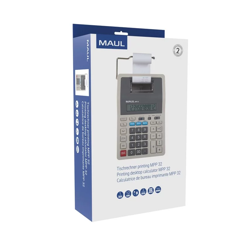 Biurkowy kalkulator z drukarką MAUL MPP 32 w kolorze szarym z dużym, 12-pozycyjnym wyświetlaczem LCD. Uniwersalny model ze wszystkimi ważnymi funkcjami. Doskonały do rachunków i sprzedaży: z funkcją obliczania marży. Odpowiedni również do pracy związanej z eksportem, dzięki możliwości przewalutowania. Zasilanie sieciowe i na baterie, z funkcją automatycznego wyłączania. Klawiatura podobna do tej w komputerze. Ergonomiczny wyświetlacz umieszczony pod kątem dla ułatwionego odczytu. Z łatwymi do czyszczenia, plastikowymi przyciskami i metalowym uchwytem na papier. Wyposażony w 3 przyciski pamięci i do zmiany znaku, obliczanie podatków i procentów, przycisk z podwójnym zerem i funkcję automatycznego zaokrąglania. 2-kolorowy wydruk zapewnia lepszą czytelność. Antypoślizgowe punkty na spodzie kalkulatora. Gwarancja: 5 lat. Wymiary: 22,6x 14,7 x 6,8 cm.