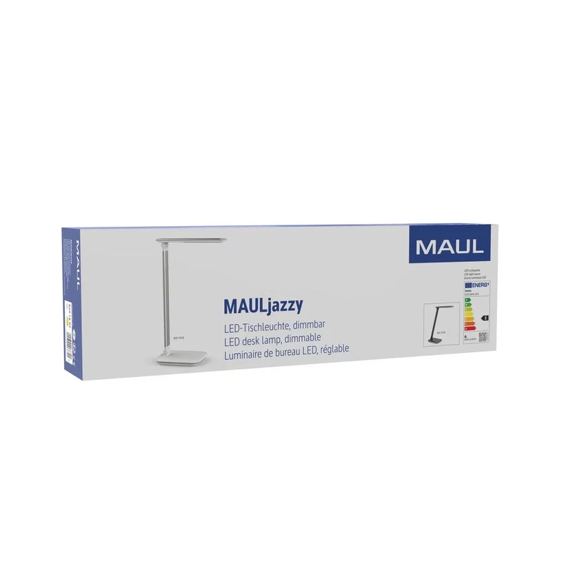 Lampa biurkowa LED MAULjazzy w kolorze czarnym z możliwością regulacji światła i USB. Atrakcyjna, elegancka i kompaktowa - zapewnia oszczędność miejsca i stanowi idealne uzupełnienie każdego biurka. Lampa posiada funkcję regulacji poziomu natężenia światła na 5 poziomach za pomocą dotykowego sterownika. Ekonomiczna – wykorzystuje nowoczesną technologię oświetlenia LED. Wyposażona w zintegrowany port USB typu A dla możliwości ładowania poprzez lampę. Regulowane ramię gwarantuje ustawienie idealnego kąta nachylenia. Wykonana z aluminium i tworzywa sztucznego, z podkładką ochronną na biurko. Wyjątkowo stabilna dzięki specjalnemu obciążeniu podstawy.Dane techniczne: Wymiary: wysokość robocza w standardowej pozycji: 42,5 cm, górne ramię z głowicą oświetleniową: 26 x 5 cm, dolne ramię: 36,5 cm, podstawa: 18 x 13 cmDługość kabla: 1,8 mGwarancja: 2 lataZłącze USB: Typ A, 5V - 500 mA Natężenie oświetlenia: 2060 lx w odległości 35 cmTemperatura barwowa: 4000K (światło białe neutralne) Liczba źródeł światła: 1Klasa energetyczna: EZużycie energii: 6 kWh/1000 hŻywotność: L70B50 - 20000 godzin świeceniaStrumień świetlny: 716 lmWłącznik: w podstawie lampyMoc znamionowa: 8WNapięcie zasilania: 100-240 VKoncepcja bezpieczeństwa technicznego opracowana przez MAUL: gwarancja bezpieczeństwa lampy biurkowej LED MAULjazzy potwierdzona przez zespół ds. optycznych, elektronicznych i mechanicznych oraz zespół inżynierów produkcji.