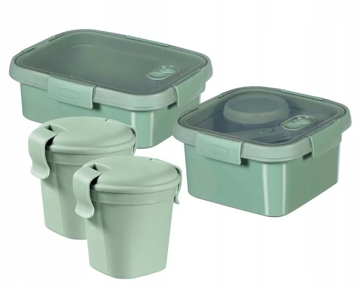Zestaw 4 pojemników na żywność Curver Smart To Go Eco Line to praktyczne i nowoczesne rozwiązanie do przechowywania, przenoszenia i podgrzewania posiłków w domu, biurze czy w podróży. W komplecie znajdują się dwa kubki 0,4L, pojemnik prostokątny 1L oraz pojemnik kwadratowy 1,1L ze sztućcami i pojemnikiem na sos – idealne do lunchu, drugiego śniadania, sałatek, przekąsek i dań obiadowych.