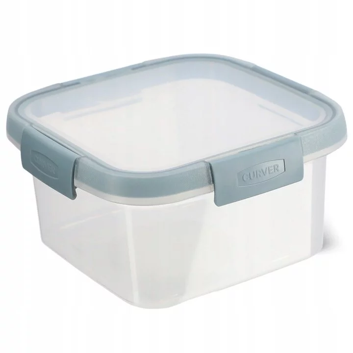 - Przezroczysty pojemnik na żywność z tworzywa sztucznego, z niebieskimi elementami. Pojemność 1,1 l, wymiary 16,5 x 16,5 x 8,7 cm. Idealny do przechowywania żywności.