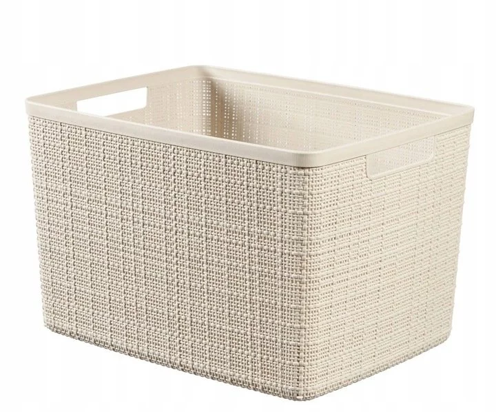 - Koszyk Curver Jute L 20L kremowy z tworzywa imitującego jutę, lekki, trwały i łatwy w czyszczeniu. Idealny do przechowywania ubrań, akcesoriów, kosmetyków i zabawek w domu.