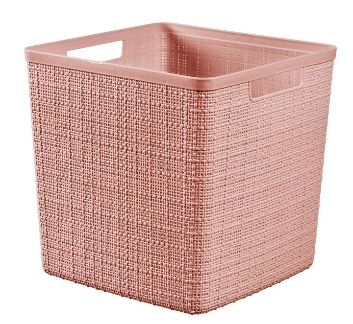 - Koszyk kwadratowy Curver Jute 17L w kolorze pudrowego różu, z tworzywa imitującego jutę. Lekki, odporny na wilgoć, łatwy w czyszczeniu, idealny do przechowywania ubrań, zabawek i akcesoriów.