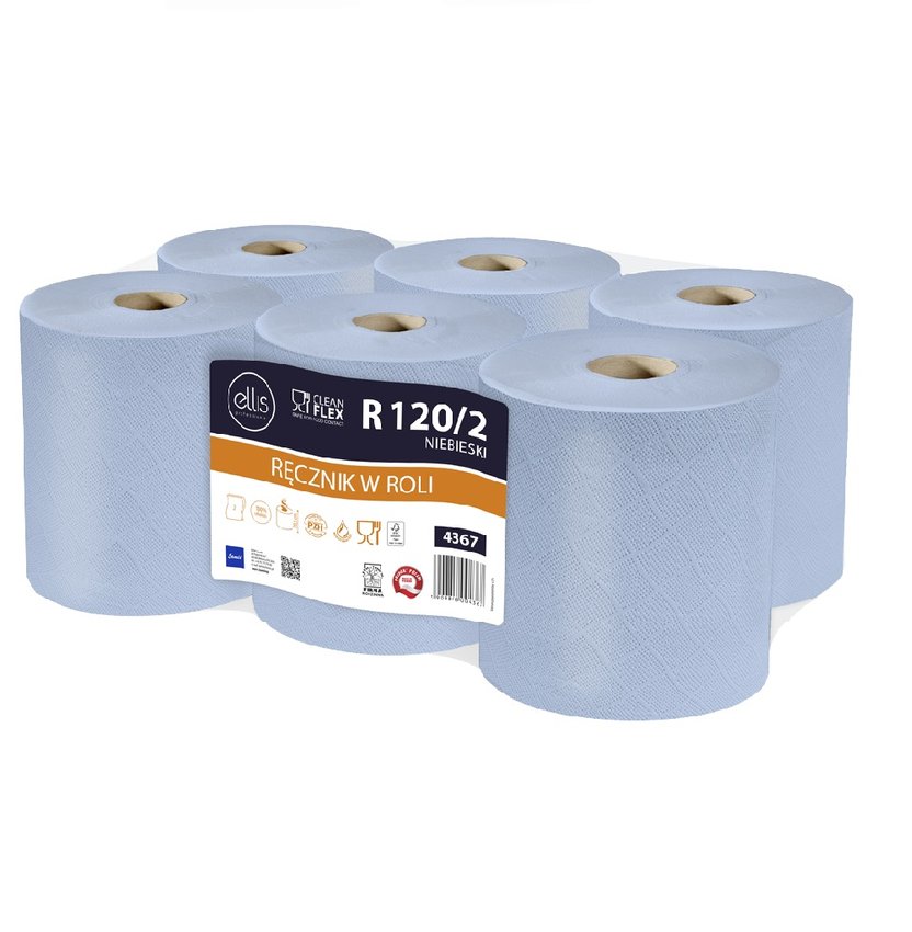 Ellis CleanFlex R120/2 to ręcznik papierowy typu maxi, z ciągłymi perforowanymi arkuszami, dzięki czemu można łatwo dobrać odpowiednią długość odcinka do aktualnej potrzeby. Rolka o długości 120 m i średnicy około 19 cm zapewnia długi czas pracy bez częstej wymiany, co jest istotne w miejscach o dużym natężeniu ruchu. Dwuwarstwowa struktura z 100% celulozy gwarantuje wysoką chłonność i odporność na rozrywanie, a niebieski odcień pozwala szybko odróżnić ręcznik techniczny od innych środków higienicznych. Zestaw zawiera 6 rolek, co przekłada się na realną oszczędność czasu i kosztów logistyki.