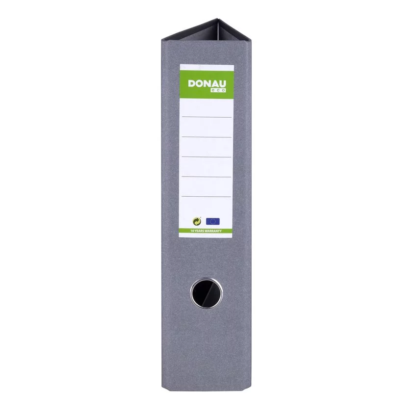 Segregator DONAU ECO, A4/80mm, grzbiet szary — Ekonomiczny segregator wykonany z tektury o grubości 2,2mm i gramaturze 1400gsm, wyposażony w dolną listwę wzmacniającą wewnątrz wyklejka papierowa o szarym zabarwieniu dźwignia solidnej jakości z dociskaczem wzmocniony otwór na palec metalowa listwa wzmacniająca, metalowa dźwignia, mechanizm, okucia i otwór na palec 5 lat gwarancji na mechanizm dźwigniowy opakowanie 10 szt.