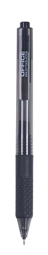 Długopis automatyczny żelowy OFFICE PRODUCTS, gr. linii 0,25mm, dł. linii 1200m, czarny — Automatyczny długopis z wymiennym wkładem żelowym o dużej pojemności, zapewniający płynne pisanie gumowy uchwyt z trójwymiarowym tłoczeniem w romby gwarantuje komfortowa pisanie i pewny chwyt plastikowy klips pozwala na łatwe przypięcie długopisu do kieszeni, notatnika lub teczki, dzięki czemu jest on zawsze pod ręką automatyczny system chowania wkładu zapobiega przypadkowemu zaplamieniu ubrania lub rąk tuszem transparentna obudowa wykonana z trwała, estetycznego tworzywa AS umożliwia kontrolowanie poziomu tuszu elementy obudowy w kolorze tuszu tusz pigmentowy, wodoodporny, nieblaknący, nietoksyczny kulka zabezpieczona przed wysychaniem nazwa marki umieszczona na klipsie na każdym długopisie kod EAN kulka wykonana z węglika wolframu