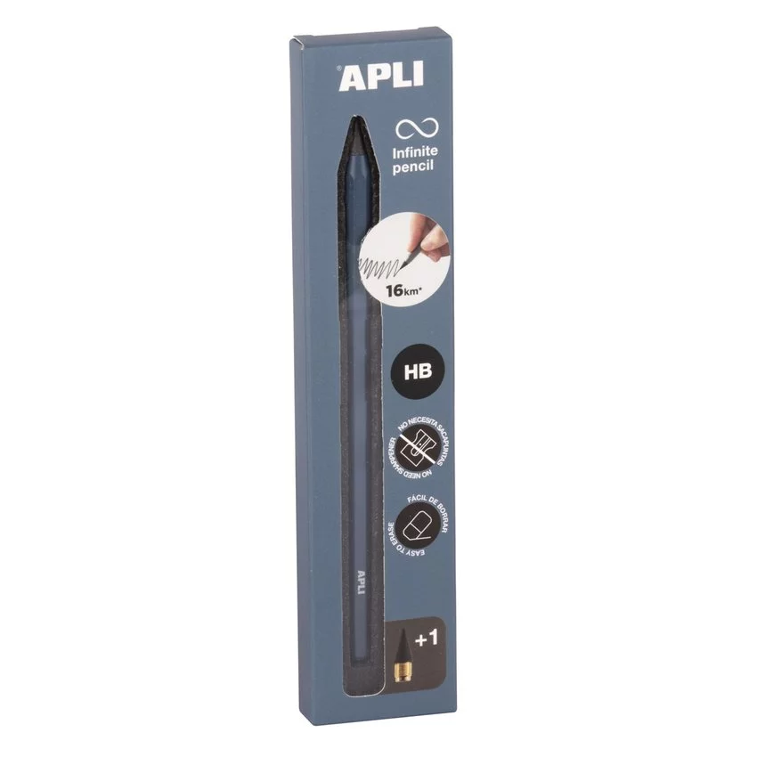 Ołówek wieczny APLI Infinite, HB, pudełko kart. z zawieszką, niebieski — Innowacyjny ołówek o wyjątkowej trwałości niezwykła trwałość, miękki, łatwo ścieralny wkład i brak konieczności używania temperówki sprawiają, że używanie ołówka jest przyjemne i bardzo komfortowa umożliwia narysowanie linii o długości 16 kilometrów bez konieczności temperowania metalowa obudowa w zestawie znajduje się dodatkowy wkład oraz przezroczysta skuwka