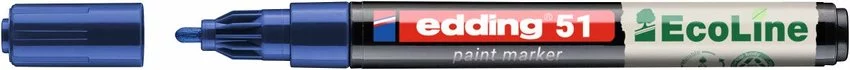Marker olejowy na bazie wody e-51 EDDING EcoLine, 1-2mm, niebieski — Profesjonalny marker olejowy do wysoce kryjącego i trwałego znakowania i etykietowania na ciemnych, przezroczystych i gładkich materiałach przyjazny dla środowiska, bezwonny tusz na bazie wody z niską zawartością lotnych związków organicznych (LZO) obudowa markera wykonana w co najmniej 75% z materiałów pochodzących z recyklingu poużytkowego tusz markera jest odporny na działanie światła, szybko wysycha i jest wodoodporny pierwszy marker olejowy z możliwością ponownego napełniania marki Edding! Dostępne są odpowiednie zapasowe końcówki wyprodukowany w Niemczech