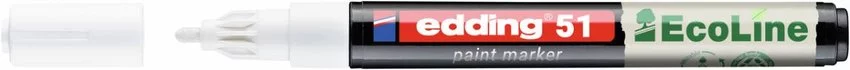 Marker olejowy na bazie wody e-51 EDDING EcoLine, 1-2mm, biały — Profesjonalny marker olejowy do wysoce kryjącego i trwałego znakowania i etykietowania na ciemnych, przezroczystych i gładkich materiałach przyjazny dla środowiska, bezwonny tusz na bazie wody z niską zawartością lotnych związków organicznych (LZO) obudowa markera wykonana w co najmniej 75% z materiałów pochodzących z recyklingu poużytkowego tusz markera jest odporny na działanie światła, szybko wysycha i jest wodoodporny pierwszy marker olejowy z możliwością ponownego napełniania marki Edding! Dostępne są odpowiednie zapasowe końcówki wyprodukowany w Niemczech