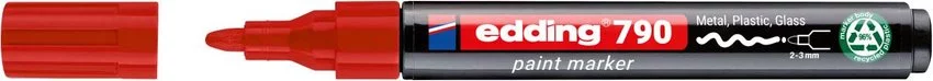 Marker olejowy e-790 EDDING, PCR, czerwony — Marker olejowy do trwałego, wysoce kryjącego znakowania gładkich materiałów, jak np. Metal, szkło, plastik doskonale nadaje się również do ciemnych i przezroczystych powierzchni okrągła końcówka pisząca o grubości 2-3 mm tusz na bazie alkoholu jest szybkoschnący, światłotrwały i wodoodporny bezwonny tusz bez dodatku toluenu/ksylenu obudowa wykonana z plastiku pochodzącego z recyklingu co najmniej 96% całkowitego plastiku użytego w markerze pochodzi z recyklingu poużytkowego