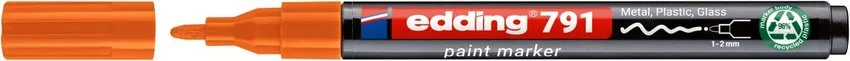 Marker olejowy e-791 EDDING, PCR, pomarańczowy — Marker olejowy do trwałego, wysoce kryjącego znakowania gładkich materiałów, jak np. Metal, szkło, plastik doskonale nadaje się również do ciemnych i przezroczystych powierzchni okrągła końcówka pisząca o grubości 1-2 mm tusz na bazie alkoholu jest szybkoschnący, światłotrwały i wodoodporny bezwonny tusz bez dodatku toluenu/ksylenu obudowa wykonana z plastiku pochodzącego z recyklingu co najmniej 96% całkowitego plastiku użytego w markerze pochodzi z recyklingu poużytkowego