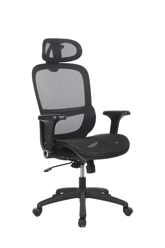 Fotel biurowy OFFICE PRODUCTS Dokos, czarny — Ergonomiczny, obrotowy fotel biurowy z solidnej jakości siatką na siedzisku, oparciu i zagłówku siedzisko bez wypełnienia pianką zapewnia przepływ powietrza i podnosi komfort podczas wielogodzinnej pracy mechanizm synchroniczny umożliwia regulację wysokości siedziska i kąta nachylenia oparcia blokada w 5 pozycjach zagłówek z regulacją wysokości i kąta nachylenia podłokietniki z regulacją wysokości i możliwością podnoszenia zapewniająca stabilność pięcioramienna, nylonowa podstawa podnośnik gazowy (siłownik) klasy 4: 80 mm kółka nylonowe, twarde, do miękkich powierzchni - średnica 50 mm szerokość oparcia (w najszerszym punkcie): 50 cm szerokość siedziska (w najszerszym punkcie): 50 cm