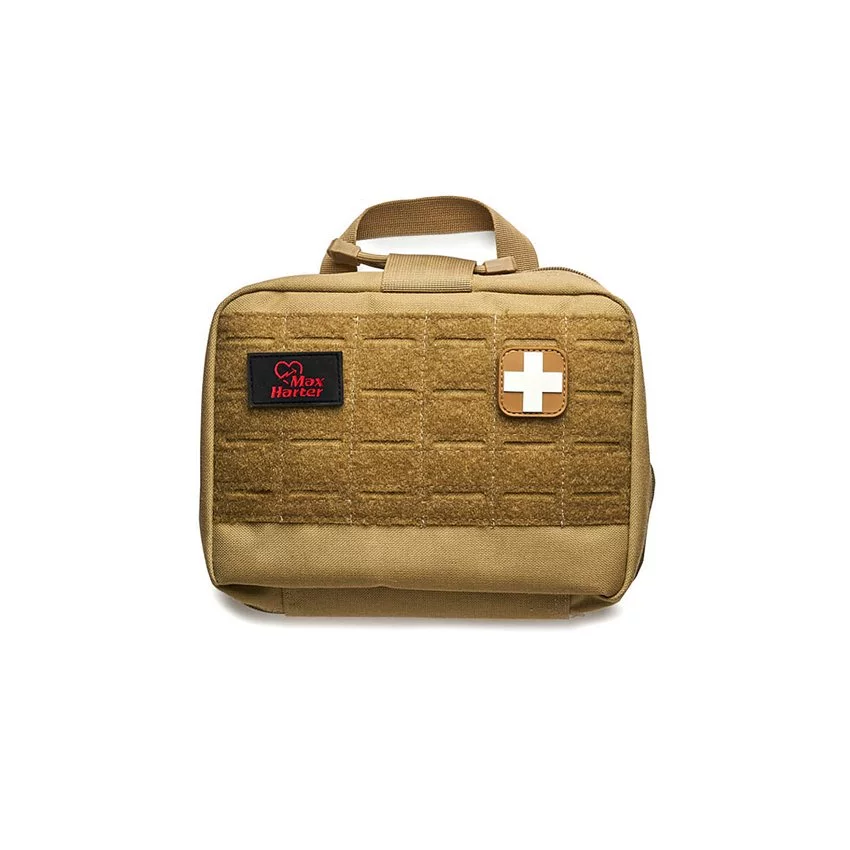 Apteczka turystyczna - Traveller MAXHARTER, model rozszerzony, piaskowy — Apteczka turystyczna to niezbędny zestaw każdego turysty wybierającego się zarówno na górski szlak jak i kajaki czy po prostu rekreacyjny wypad. Zawiera starannie dobrane, indywidualne wyposażenie składające się głównie z produktów medycznych, pozwalające rozwiązać wiele kryzysowych sytuacji i skutecznie podjąć działania ratownicze. Apteczka rozszerzona TR to produkt dedykowany dla nauczycieli wycieczek szkolnych, przewodników turystycznych, rodzin z dziećmi lub po prostu jako zbiorowa apteczka dla kilkuosobowych grup. Skład wyposażenia: Rękawiczki diagnostyczne, nitrylowe - 10 szt. Maseczka do RKO z filtrem - 1 szt. Opatrunek z wkładem chłonnym 5 x 7,2 cm - 4 szt. Opatrunek z wkładem chłonnym 10 x 10 cm - 2 szt. Siatka opatrunkowa nr 3, długość 1 m - 1 szt. Siatka opatrunkowa nr 6, długość 1 m - 1 szt. Paski do zamykania ran 3 x 75 mm (op. 5 sztuk) - 1 szt. Paski do zamykania ran 12 x 100 mm (op. 6 sztuk) - 1 szt. Przylepiec tkaninowy bez opatrunku 2,5 cm x 5 m - 1 szt. Plaster na odciski 19 mm x 76 mm - 4 szt. Plaster na odciski 25 mm x 76 mm - 2 szt. Pęseta jednorazowa - 1 szt. Chusta trójkątna włókninowa - 2 szt. Szyna usztywniająca 46 cm - 1 szt. Nożyczki ratownicze Black Front PRO - 1 szt. Opaska elastyczna 12 cm x 4 m - 3 szt. Opaska dziana 10 cm x 4 m - 3 szt. Gaza opatrunkowa jałowa 1 m2 - 2 szt. Kompres gazowe jałowe 10 x 10 cm 4 - szt. Koc ratunkowy NRC (folia izotermiczna) - 4 szt. Żel schładzający o pojemności 120ml - 1 szt. Światło chemiczne Light Stick - 1 szt. Kleszczołapki - 1 szt. Ponczo przeciwdeszczowe - 1 szt. Opaska uciskowa, staza taktyczna Black Front - 1 szt. Marker permanentny - 1 szt. Apteczka wraz z panelem rzepowym systemu Molle - 1 szt. Gumki (troki) mocujące szybkiego montażu - 2 szt. Saszetka na zestaw: Saszetka Trauma Responder (TR) to futerał zaprojektowany na rozbudowane apteczki pierwszej pomocy, wyposażone w produkty medyczn