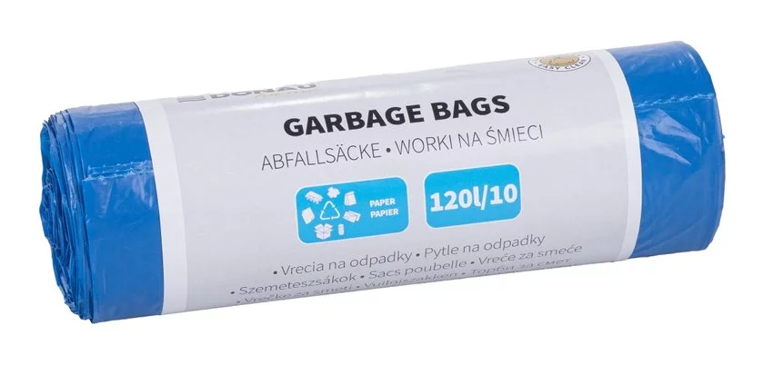 Worki na śmieci DONAU HOME, do segregacji, papier (LDPE), 120l, 10 szt., niebieskie — Stworzona do gromadzenia odpadów papierowych w ramach selektywnej zbiórki wykonane z trwała tworzywa LDPE, odpornego na rozdarcia i wilgoć idealne do codziennego użytku zarówno w gospodarstwach domowych, jak i przestrzeniach publicznych 10 szt. W j. S.