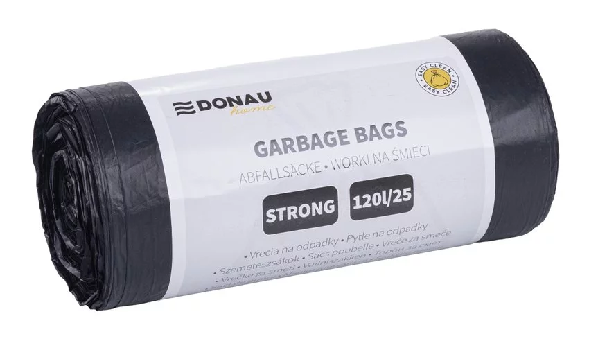 Worki na śmieci DONAU HOME, mocne (LDPE), 120l, 25 szt., czarne — Wyjątkowo trwała worki wykonane z grubego, elastycznego tworzywa LDPE zaprojektowane z myślą o biurach, przestrzeniach komunalnych i gospodarstwach domowych odporne na rozdarcia, przeciążenia i wilgoć 25 szt. W j. S.
