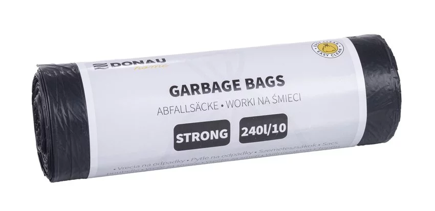 Worki na śmieci DONAU HOME, mocne (LDPE), 240l, 10 szt., czarne — Wyjątkowo trwała worki wykonane z grubego, elastycznego tworzywa LDPE zaprojektowane z myślą o biurach, przestrzeniach komunalnych i gospodarstwach domowych odporne na rozdarcia, przeciążenia i wilgoć 10 szt. W j. S.