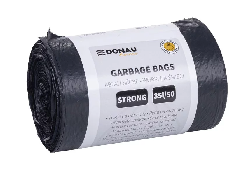 Worki na śmieci DONAU HOME, mocne (LDPE), 35l, 50 szt., czarne — Wyjątkowo trwała worki wykonane z grubego, elastycznego tworzywa LDPE zaprojektowane z myślą o biurach, przestrzeniach komunalnych i gospodarstwach domowych odporne na rozdarcia, przeciążenia i wilgoć 50 szt. W j. S.