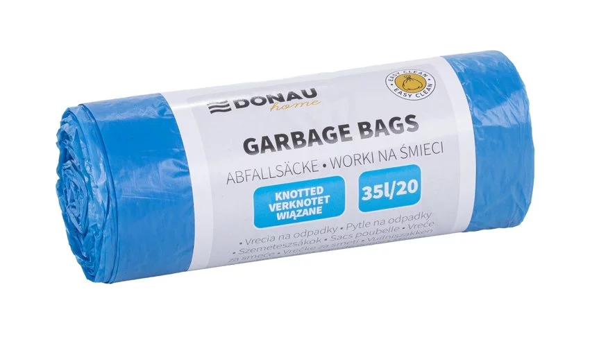 Worki na śmieci DONAU HOME, wiązane (LDHD), 35l, 20 szt., niebieskie — Praktyczne worki wiązane wykonane z trwała folii LDHD idealne do koszy w łazienkach, kuchniach czy biurach 20 szt. W j. S.