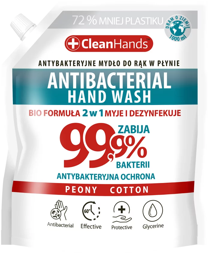 Mydło antybakteryjne CLEAN HANDS, BIO 99,9% Peony&Cotton, 1000 ml — Przeznaczenie do higienicznego mycia rąk o działaniu bakteriobójczym. Zawiera potwierdzoną badaniami formułę 2w1, która skutecznie dezynfekuje ręce podczas mycia. Usuwa 99,9% chrobotwórczych bakterii już w 60 sekund, w tym Pseudomonas aeruginosa, Staphylococcus aureus, Escherichia coli, Enterococcus hirae. Wzbogacone o glicerynę, o subtelnym zapachu kwiatów peonii i bawełny. Nie wysusza i nie drażni skóry, nawet przy częstym i długotrwalym stosowaniu. Mydło niezastąpione, kiedy Twoje zdrowie wymaga specjalnej ochrony.