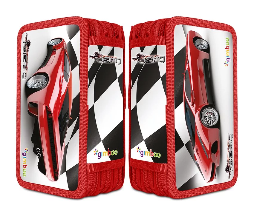Piórnik szkolny GIMBOO, z wyposażeniem, 3 komory, wyścigi, czerwony — Piórnik szkolny z kolekcji GIMBOO 2024 posiada 3 komory zestaw zawiera wyposażenie (linijkę, ekierkę, 3 szt. Długopisów, ołówek, gumkę, temperówkę, 16 szt. Flamastrów, 16 szt. Kredek)