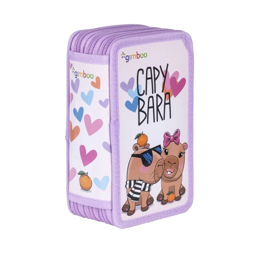 Piórnik szkolny GIMBOO, z wyposażeniem, 3 komory, mix wzorów — Piórnik szkolny z kolekcji GIMBOO 2025 posiada 3 komory zestaw zawiera wyposażenie (linijkę, ekierkę, 3 szt. Długopisów, ołówek, gumkę, temperówkę, 16 szt. Flamastrów, 16 szt. Kredek)