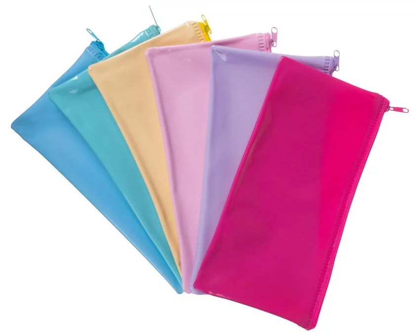 Piórnik saszetka GIMBOO, płaska, PVC, 22x11 cm, 280 MIC, mix kolorów pastel — Piórnik-saszetka z zamkiem błyskawicznym bez wyposażenia mix kolorów