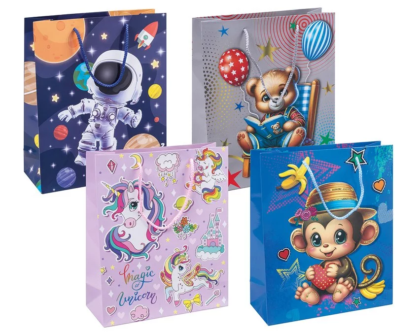 Torebka na prezenty DONAU HOME laminowana 25x30x10cm dziecięca sznurek mix wzorów