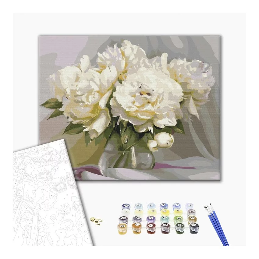 Malowanie po numerach BRUSHME, 40x50 cm, wyśmienita delikatność piwonii, 1 szt., w pudełku — Obraz do malowania po numerach, zapakowany w pudełko to doskonała forma relaksu, która pozwala każdemu poczuć się jak prawdziwy artysta dzięki numerom, malowanie staje się łatwe i przyjemne w zestawie: solidnej jakości płótno z naniesionymi konturami rysunku, oznaczonymi liczbą zestaw farb akrylowych, ponumerowanych zgodnie z numerami kolorów, na które podzielone jest płótno 3 szt. Pędzli o różnej wielkości: mały, średni i duży, dzięki czemu można dopasować rozmiar pędzla do malowanego obszaru instrukcja