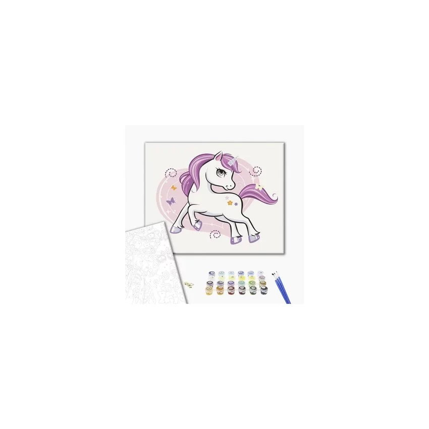 Malowanie po numerach BRUSHME, 30x40 cm, kids, błyszczący jednorożec, 1 szt. — Obraz do malowania po numerach dla dzieci to doskonała forma relaksu, która pozwala każdemu poczuć się jak prawdziwy artysta dzięki numerom, malowanie staje się łatwe i przyjemne w zestawie: solidnej jakości płótno z naniesionymi konturami rysunku, oznaczonymi liczbą zestaw farb akrylowych, ponumerowanych zgodnie z numerami kolorów, na które podzielone jest płótno 3 szt. Pędzli o różnej wielkości: mały, średni i duży, dzięki czemu można dopasować rozmiar pędzla do malowanego obszaru instrukcja rysowania dla początkujących