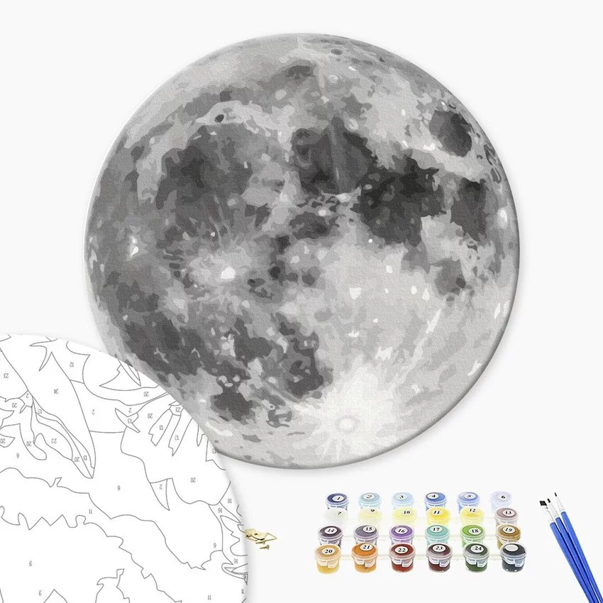 Malowanie po numerach BRUSHME, okrągły, śr. 40 cm, księżyc, 1 szt. — Okrągły obraz na płótnie do malowania po numerach doskonała forma relaksu, pozwalająca każdemu poczuć się jak prawdziwy artysta obraz jest podzielony na pola, z których każde oznaczone jest numerem odpowiadającym temu samemu numerowi słoiczka z farbą stworzone własnoręcznie dzieło ozdobi Twój dom lub będzie niezwykłym prezentem dla kogoś wyjątkowego w zestawie znajduje się wszystko czego potrzebujesz aby od razu zacząć przygodę z malowaniem: solidnej jakości płótno na okrągłym, drewnianym blejtramie z naniesionymi konturami rysunku, oznaczonymi liczbą zestaw farb akrylowych, ponumerowanych zgodnie z numerami kolorów, na które podzielone jest płótno 3 szt. Pędzli o różnej wielkości: mały, średni i duży, dzięki czemu można dopasować rozmiar pędzla do malowanego obszaru
