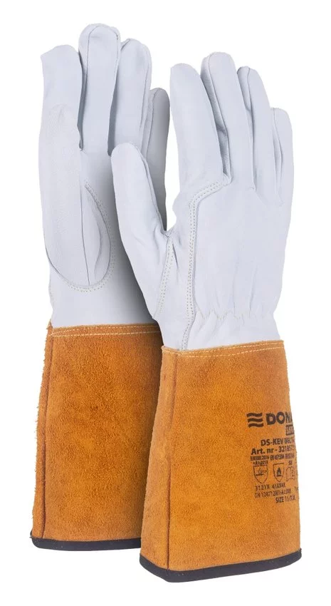 Rękawice spawalnicze DONAU SAFETY DS-KEV WELTIG, kevlar, skóra kozia, rozm. 10/XL, biało-złote — Rękawice ochronne spawalnicze do spawania metodą TIG wykonane z bardzo dobrej jakości licowej skóry koziej stworzona do prac w przemyśle spawalniczym, energetycznym, metalurgicznym elastyczna, miękka skóra i brak podszewki sprawiają, że sprawdza się przy pracach spawalniczych wymagających precyzji szyte nicią kevlarową, zwiększającą trwała rękawicy (odporna na wysokie temperatury) podwójne szwy dla wzmocnienia rękawicy bardzo trwała, zapewniająca precyzyjny chwyt elastyczny nadgarstek dla lepszego dopasowania zakończone długim, sztywnym mankietem ze skóry bydlęcej dwoinowej rękawice ochronne chroniące przed uszkodzeniami mechanicznymi rękawice ochronne chroniące przed zagrożeniami termicznymi (odporne na wysokie temperatury oraz odpryski ciekłego metalu) zgodność z normami EN 388:2016+A1:2018 (3121X), EN 407:2004 (41XX4X), EN ISO 21420:2020, EN 12477:2001+A1:2005, Typ B