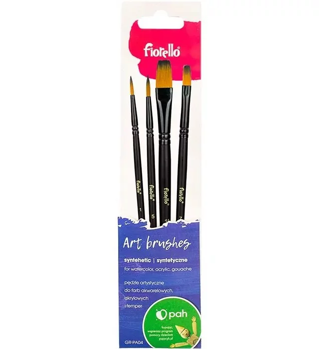 Pędzle artystyczne FIORELLO GR-PA04 to zestaw czterech wysokiej jakości pędzli okrągłych, przeznaczonych do pracy z różnymi rodzajami farb – akrylowych, akwarelowych, temperowych i gwaszu. Wykonane z dwukolorowego, elastycznego włosia nylonowego, zapewniają precyzję i kontrolę podczas malowania, utrzymując szpic nawet przy długotrwałym użytkowaniu.