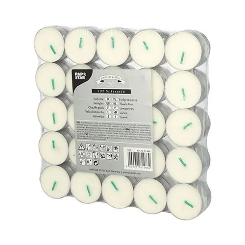 - Podgrzewacze Papstar ze stearyny, białe tealighty o średnicy 37 mm. Zestaw 50 sztuk, równomierne i czyste spalanie, stabilny płomień. Idealne do domu, gastronomii, dekoracji i uroczystości.