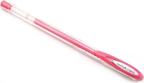 - Długopis żelowy z wodoodpornym tuszem pigmentowym w kolorze różowym. Pisze gładko, nie blaknie, grubość linii ok. 0,3 mm. Wkład wymienny UMR-7N, 5 lat gwarancji przydatności tuszu.