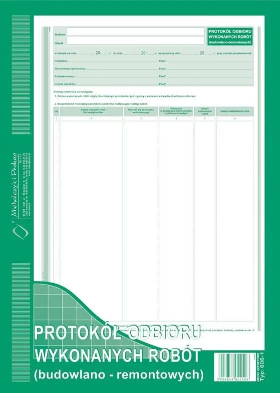 Protokół Odbioru Wyk. Robót Budow.-Remont. A4 Offset 606-1 /MiP