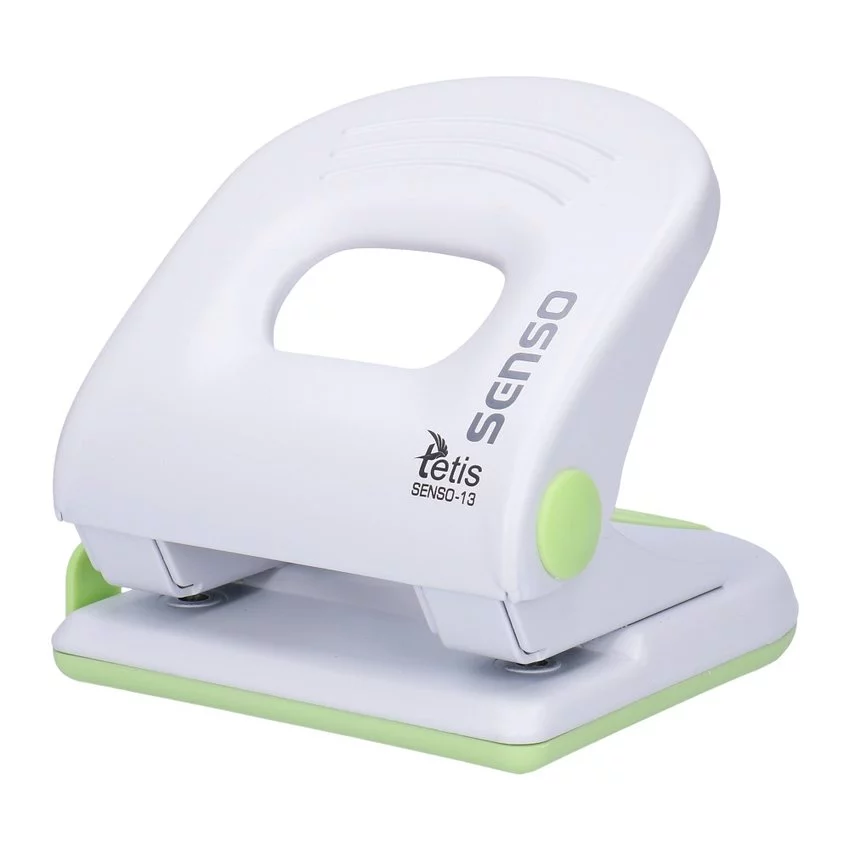 TETIS Senso 13 to mały dziurkacz dający duże możliwości. Całość wykonana jest z metalu a jego wykończenie z tworzywa sztucznego. Jednorazowo jest on w stanie przedziurkować do 40 kartek papieru o grubości 80 g/m2. Specjalny uchylany pojemnik na ścinki pozwala je usunąć bez konieczności zdejmowania całego spodu. Dodatkowo dziurkacz posiada wskaźnik środka strony oraz ogranicznik formatu dla jeszcze bardziej precyzyjnego rozmieszczenia dziurek. Producent daje na dziurkacz 5 lat gwarancji.