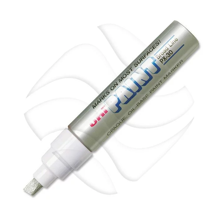 • Marker olejowy Uni PX-30 ze ściętą, grubą końcówką (linia do 5,7 mm), wodoodporny i światłoodporny. Do pisania po śliskich powierzchniach (metal, szkło, kamień, plastik, styropian, drewno). Srebrny tusz.