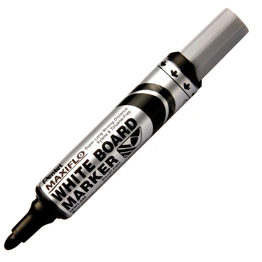 Marker suchościeralny Pentel Maxiflo MWL5M-A w kolorze czarnym to narzędzie stworzone z myślą o intensywnej, codziennej pracy z tablicą. Wyrazista, głęboka czerń i gruba końcówka zapewniają doskonałą widoczność notatek nawet z końca sali.