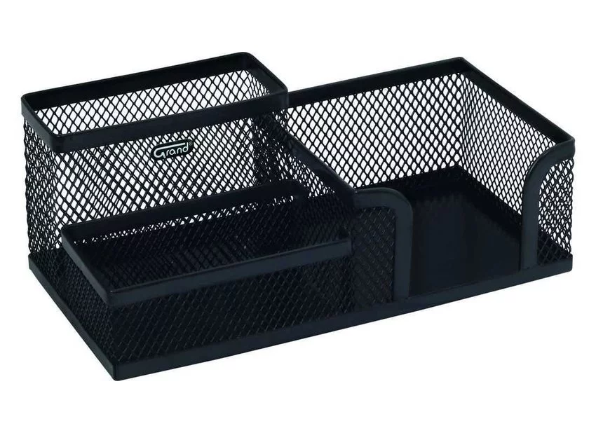 Wszystkie artykuły piśmiennicze i karteczki z notatkami, możesz uporządkować, wykorzystując przybornik marki Grand. To solidny organizer, wykonany z metalowej siateczki, pokrytej czarnym lakierem. Jest wyposażony w 3 przegrody. Jedna jest przeznaczona na karteczki, druga na drobne przedmioty, takie jak gumki i spinacze, a trzecia na artykuły do pisania.