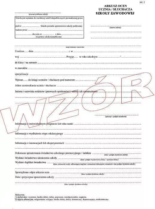 Arkusz Ocen Ucznia Szkoły Zawodowej MEN-I/45a/2 /W-X
