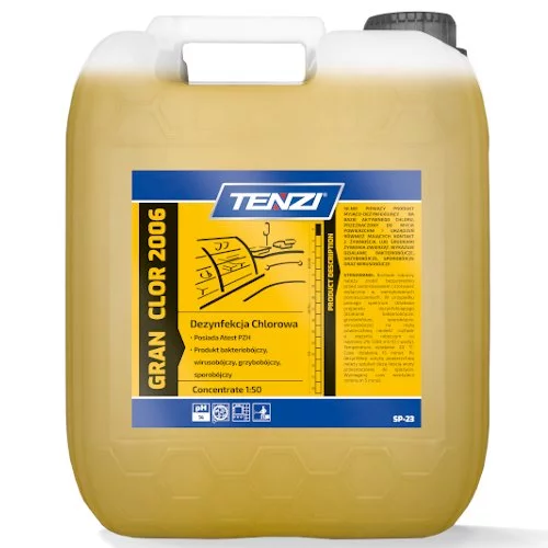 - Gran Clor 2006 TENZI 20L – wysokoalkaliczny preparat myjąco‑dezynfekujący z aktywnym chlorem. Skuteczny na bakterie, grzyby, przetrwalniki. Do powierzchni kontaktujących się z żywnością.