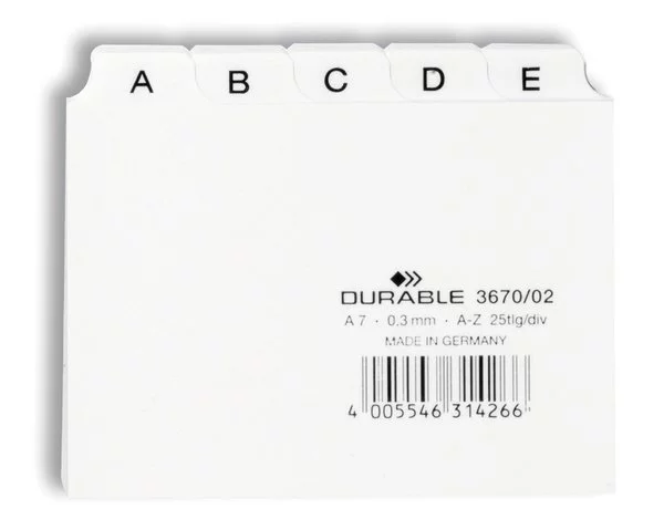 Przekładki do Kartotek A-Z 5/5 PCW 0,3mm Indeksy 20mm Poziome A7 25szt. Białe /Durable 367002