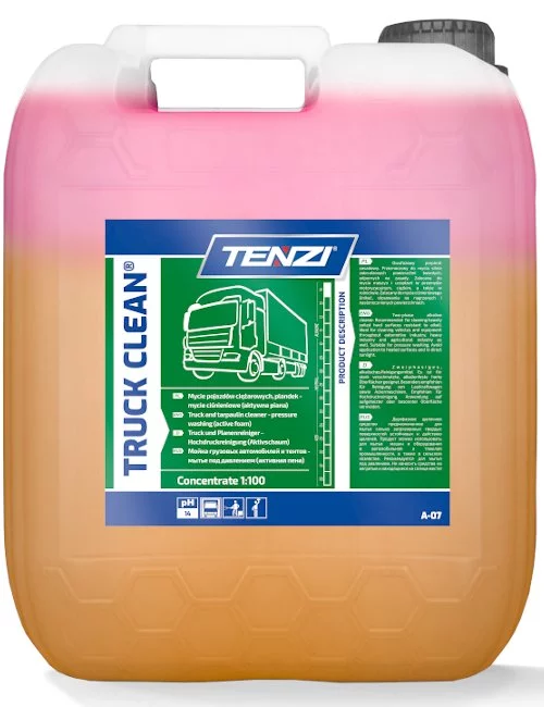 - Truck Clean TENZI 20L – silny, alkaliczny płyn do mycia skrajnie zabrudzonych pojazdów ciężarowych, maszyn budowlanych i rolniczych, silników, plandek, cystern; do mycia ciśnieniowego i ręcznego.