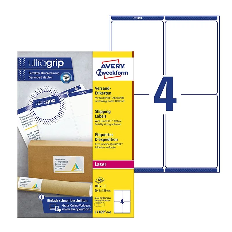 - Etykiety wysyłkowe Avery Zweckform L7168-100, mocno kryjące. Łatwe odklejanie. Ostry wydruk i znakomite przyleganie do powierzchni. Do drukarek laserowych.