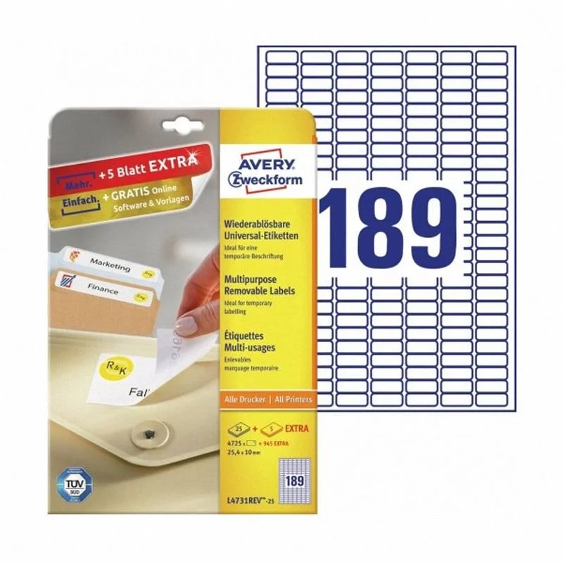 - Etykiety samoprzylepne Avery Zweckform L4731REV-25 w kolorze białym, usuwalne. Łatwe w usunięciu, nie pozostawiają śladów kleju. Do drukarek atramentowych, laserowych oraz kopiarek. Posiadają certyfikat ekologiczny FSC oraz certyfikat jakości TÜV.