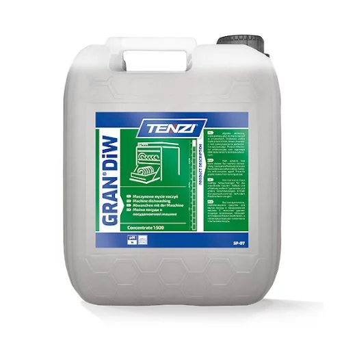 - Skoncentrowany, bezzapachowy płyn do zmywarek TENZI Gran Diw 5L do szkła, aluminium i tworzyw. Wysoko alkaliczny, antykorozyjny, zapobiega żółknięciu naczyń, zalecany do 60°C.